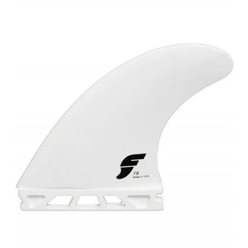 F8 Thermotech thruster fin template is designed to work for all surfers in all conditions. The solid base directly transfers power, while the tip is still flexible and resilient allowing it to bend and load up. The White Composite (Thermotech) fins have a consistent flex that hold great on the bottom, and then release through turns. If you’re looking for that glass on look, with a higher performance feel than other composites, then you have to try the F series from Futures. The F8 is a large size surfboard fin template.