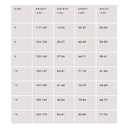 | Sizes | 4 | 6 | 8 | 10 | 12 | 14 | 16 |