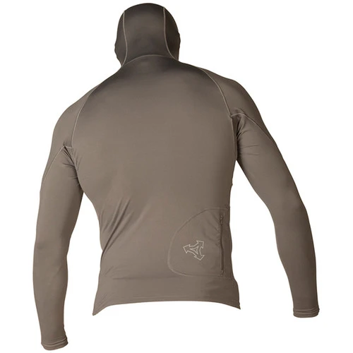 Hydrophobic, premium 6-ounce 4-way stretch Drylock top repels water for better warmth and comfort. Fast drying and comfortable; ideal for layering or wearing alone for maximum sun protection. Comfortable, snug “second skin” fit, with a sturdy brim built into the hood for additional sun protection, and a flat right hip zipper pocket. Tested and UPF rated to block over 98% of UVA/UVB radiation from the sun.